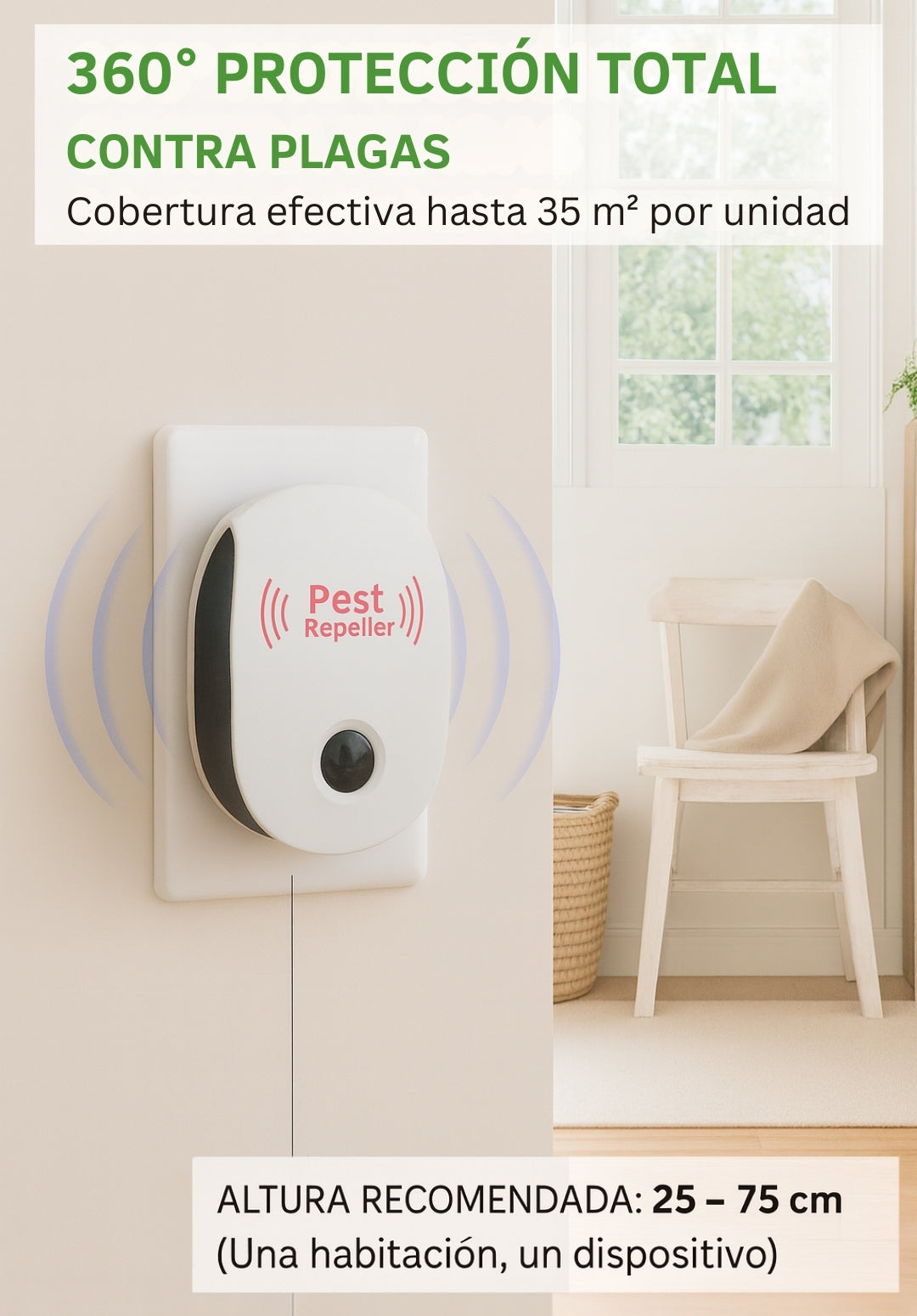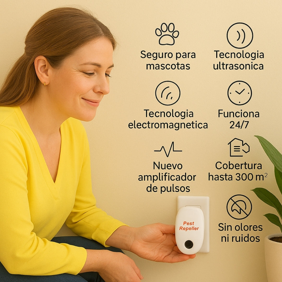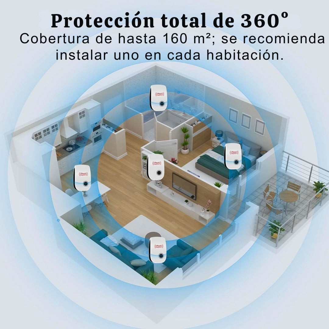 - Protección ultrasónica 360°: ahuyenta cucarachas, ratones, mosquitos, arañas, hormigas y otras plagas sin químicos.