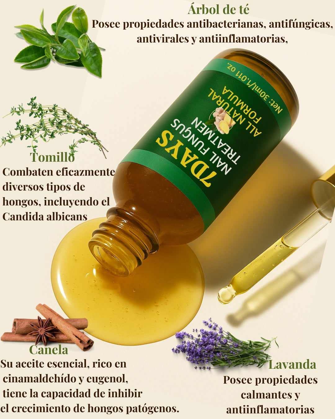 Ingredientes puros, eficacia real! Cada gota del aceite 7 Days está elaborada con extractos naturales de alta calidad, cultivados sin pesticidas ni químicos agresivos. Su combinación única de árbol de té, tomillo, lavanda y canela actúa desde la raíz del problema, respetando tu piel y el medio ambiente. Puro, potente y sostenible: así es como se eliminan los hongos de verdad.
