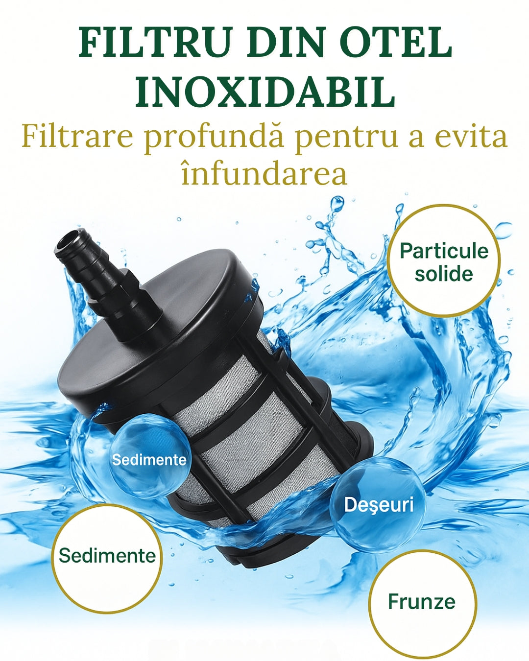 Filtrul din oțel inoxidabil reține eficient sedimentele, frunzele și impuritățile, prevenind înfundarea și prelungind durata de viață a echipamentului.