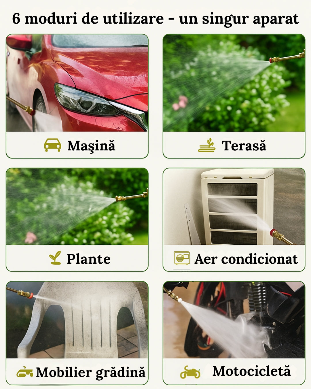 WaterJet îți oferă puterea de a curăța rapid și eficient mașina, terasa, plantele, aparatul de aer condiționat, mobilierul de grădină și motocicleta. Un singur aparat, curățenie completă!
