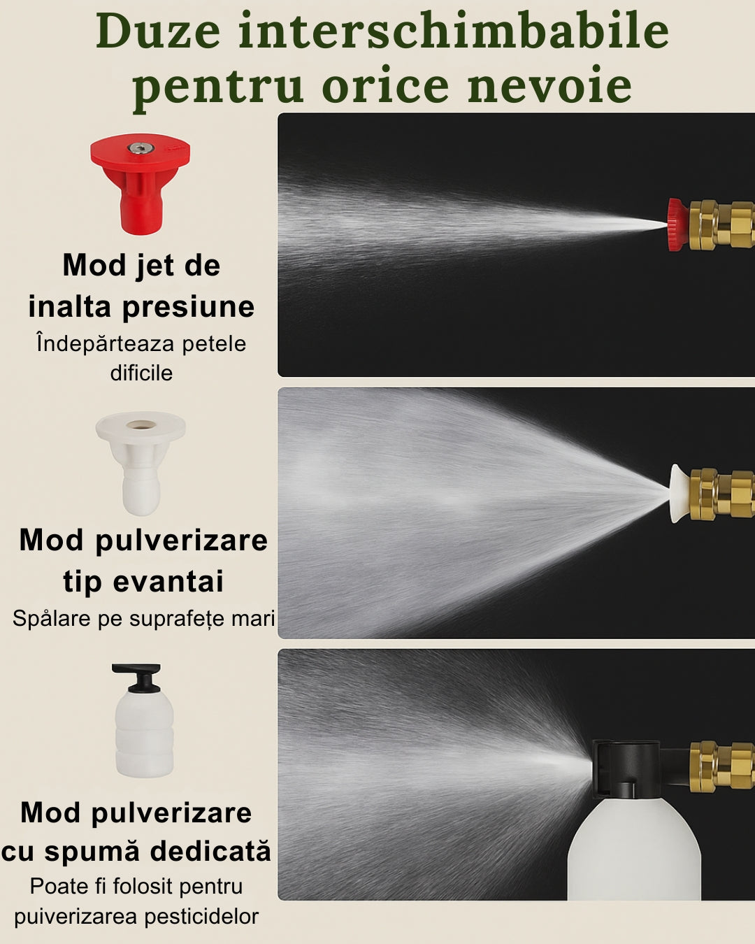 Da. Pistolul vine cu mai multe duze interschimbabile care permit reglarea presiunii și tipului de pulverizare (jet puternic, evantai, spumă).